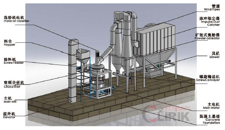 HGM超細(xì)磨粉機(jī)生產(chǎn)線包括破碎機(jī)、斗式提升機(jī)、儲(chǔ)料倉、振動(dòng)給料機(jī)、超細(xì)磨粉機(jī)主機(jī)、變頻分級(jí)機(jī)、集粉器、脈沖除塵器、高壓風(fēng)機(jī)、空氣壓縮機(jī)、電氣控制系統(tǒng)。